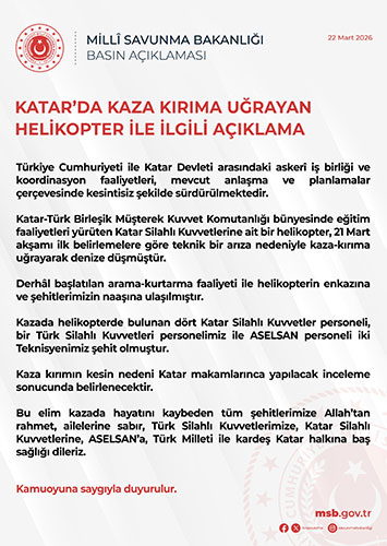 Katar-Türk Birleşik Müşterek Kuvvet Komutanlığı bünyesinde eğitim faaliyetleri yürüten Katar Silahlı Kuvvetleri’ne ait bir helikopter, 21 Mart akşamı ilk belirlemelere göre teknik bir arıza nedeniyle kaza-kırıma uğrayarak denize düşmüştür.