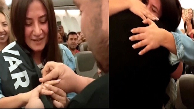 Adana-İzmir seferini yapan uçakta seyahat eden adam, kız arkadaşına 10 bin metrede evlilik teklif etti. Sürpriz karşısında şaşıran genç kadın, "Evet" yanıtını verdi. Adam, uçaktaki diğer yolcuların alkışları arasında kız arkadaşının parmağına yüzük taktı