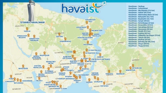 HAVAİST hatları ve durakları: