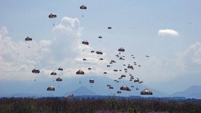 Fotoğraf, Eylül 2019’da Güney Fransa’daki Ger Azet atlama alanı üzerinde gerçekleştirilen uçuş testi sırasında paraşütçülerin başarılı bir şekilde atlayışını gösteriyor.
