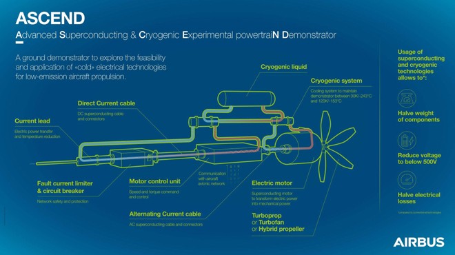 Airbus, düşük ve sıfır emisyonlu uçuş için hazır olan tahrik mimarisini optimize etmek amacıyla gelecek vaat eden teknolojilerin fizibilitesini keşfetmek için ASCEND'i kullanacak. Sonuçların, sistem kurulumunun hacmi ve karmaşıklığı azaldıkça bileşen ağırlığı ve elektrik kayıpları potansiyelinin en azından yarı yarıya azaltması ve mevcut sistemlere kıyasla voltajda 500 V'un altına düşmesi bekleniyor.