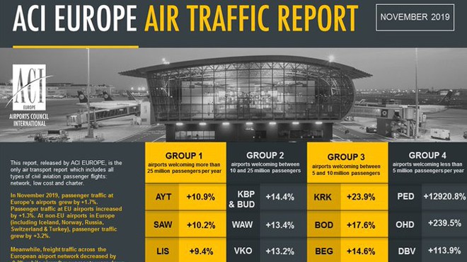 ACI Kasım 2019 verilerine göre, 25 milyondan fazla yolcu kapasitesine sahip 1. Grup havalimanları içinde Antalya Havalimanı yüzde 10.9 büyüme ile ilk sırada yer aldı. Sabiha Gökçen Havalimanı ise hemen ardından 10.2 büyüme ile ikinci sıraya yerleşti.