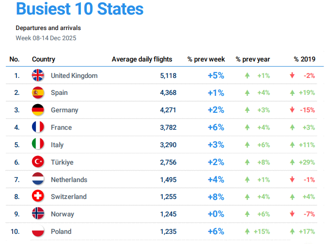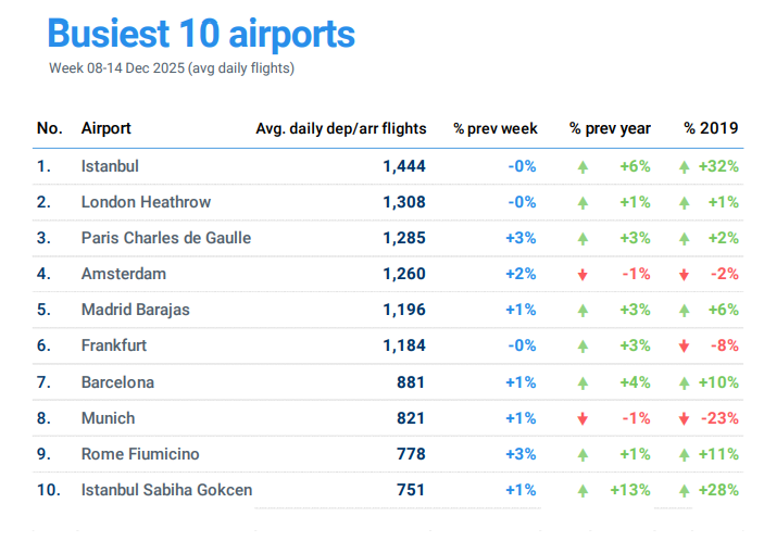 2025 Yılı 8-14 Aralık döneminde, Avrupa’daki en yoğun havalimanları arasında; İstanbul Havalimanı, günlük ortalama 1.444 uçuş ile ilk sırada yer aldı. İstanbul Havalimanı, 2024 yılına göre %6, 2019 yılına göre ise %32 oranında artış gösterdi.