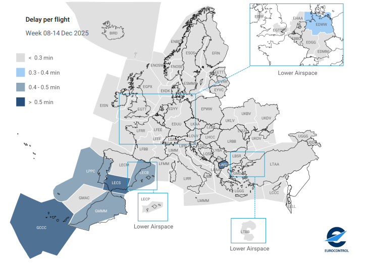 EUROCONTROL tarafından, 18 Aralık 2025 tarihinde yayımlanan Avrupa Havacılık Genel Bakış Raporu’nda yer alan “8-14 Aralık 2025” dönemi hava trafik istatistiklerine göre;