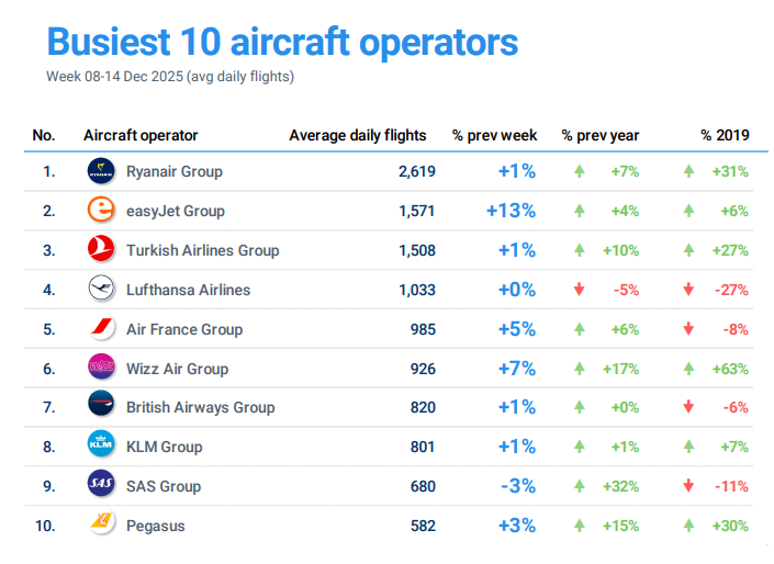 2025 Yılı 8-14 Aralık döneminde, Avrupa’da en fazla uçuş gerçekleştiren 10 havayolu işletmesi arasında;