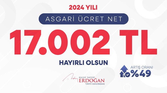 Cumhurbaşkanı Erdoğan, sosyal medya hesabından yaptığı paylaşımda, "2024 yılında asgari ücret, yüzde 49 artışla net 17 bin 2 TL olarak uygulanacaktır. Ülkemize ve milletimize hayırlı olsun." ifadelerini kullandı.