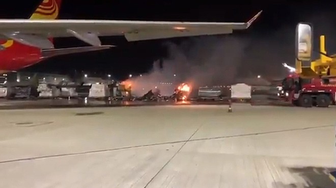 Uçağa yüklenmeye hazırlanan ve içerisinde binlerce cep telefonu bulunan paletlerden biri aniden tutuştu. Alevler kısa sürede diğer paletlere de sıçradı. İtfaiye ekipleri müdahale ederek alevleri söndürdü.