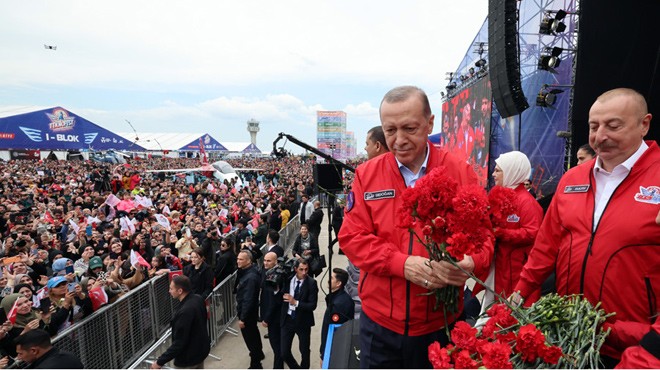 Erdoğan, “İnşallah gençler, 14 Mayıs'ta tüm bu utanç sahnelerine son vermeye hazır mısınız? Seçimlerin ardından tüm vaktimizi ve enerjimizi Türkiye Yüzyılı'nın süratle inşasına ayırmasına hazır mıyız? Cumhuriyetimizin yeni asrı için hayal ettiğimiz, yıllardır hazırlığını yaptığımız projeleri hızlandıracağız. Gençlerimize teslim edeceğimiz Türkiye'nin artık son dokunuşlarını yapacak eksiklerini tamamlayacağız. Baki kalan bu kubbede, hoş bir seda imiş meğer diyerek yola devam. Büyük ve güçlü Türkiye mirasını sizlere emanet edeceğiz. Her zaman söylediğimiz hususu tekrarlamak istiyorum. Biz 21 yıldır bu ülkede sadece eser ve hizmet siyaseti yaptık. Bunun en büyük ispatı da sadece son birkaç ayda açılışını yaptığımız yatırımlar, müjdesini verdiğimiz hizmetlerdir. Biz müjde açıkladıkça birileri bozuluyor, kızıyor, adeta karalar bağlıyor. Şimdi de çıkmış Giresun'daki kardeşlerime ne diyor biliyor musunuz? Fındığın fiyatını 4 dolar artıracağım diyor. İnandınız mı? Hayatın yalan ya. Siz neyi söz verdiniz de yerine getirdiniz. İstanbul'da su fiyatlarını ne yapacaklardı, indireceklerdi, ne oldu? Otobüs fiyatlarını indireceklerdi, ne yaptılar? Ankara öyle, İzmir öyle. Hayatları yalan. Şimdi daha ileri gidip sizin müjdeniz de bir türlü bitmedi diyenler çıkıyor. Bizim yanımızda TEKNOFEST kuşağı oldukça bu ülkede müjdeler hiçbir zaman bitmeyecek. Yolumuza yeni müjdeler ve başarılarla devam edeceğiz" dedi.