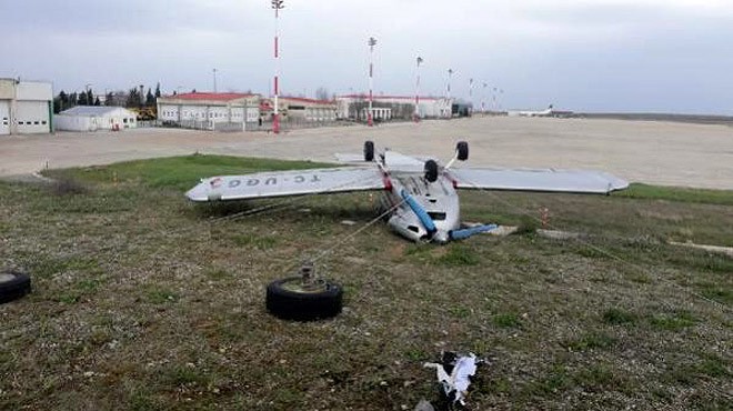 Tekirdağ'ın Çorlu ilçesinde 2 gündür etkili olan şiddetli rüzgar, Çorlu Atatürk Havalimanı'nda park halinde bulunan eğitim uçağını ters döndürdü