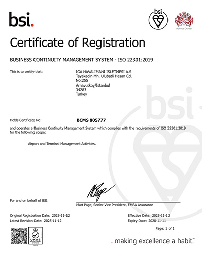 İGA İstanbul Havalimanı, “havalimanı ve terminal işletme faaliyetleri” kapsamında uluslararası geçerliliğe sahip “ISO 22301 İş Sürekliliği Yönetim Sistemi” sertifikasını almaya hak kazandı.