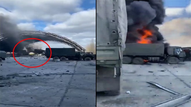 Görüntülerde, ‘Hayal’ anlamına gelen ‘Mriya’nın bakım için bulunduğu hangarda bombardıman sonucu ağır hasar aldığı ve yandığı görülüyor. Hangar ile birlikte etraftaki askeri araçların da yandığı görülüyor.