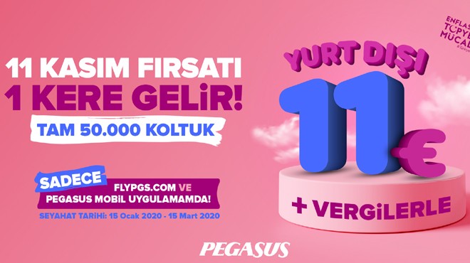 Pegasus’un 11 Kasım Fırsatı kampanyasından yararlanmak isteyen misafirler, kampanya kapsamında biletlerini 11-12 Kasım’da www.flypgs.com internet sitesinden veya Pegasus Mobil uygulaması üzerinden alarak, 15 Ocak – 15 Mart 2020 tarihleri arasında seçili yurt dışı hatlarına 11 Euro + vergileri ödeyerek uçabiliyor.