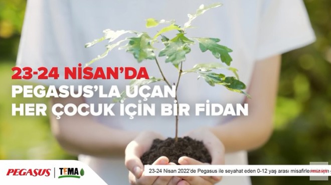 Türkiye’nin dijital hava yolu Pegasus, 23-24 Nisan 2022 tarihlerinde Pegasus’la uçan her çocuğun biletini TEMA Vakfı aracılığıyla bir fidana dönüştürecek. 23 Nisan Ulusal Egemenlik ve Çocuk Bayramı vesilesiyle bağışlanacak fidanlarla Pegasus Çocuk Ormanı oluşturulacak. Bu tarihlerde Pegasus Hava Yolları ile uçan tüm 0-12 yaş arası çocuklar adına toplam 15 bin fidan dikimi yapılacak.