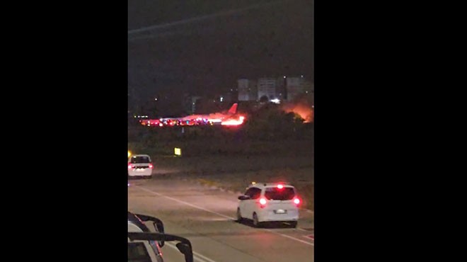 İtfaiye, polis ve sağlık ekipleri uçağa müdahale ediyor. Uçak alev alev yanıyor. Yolcuların tahliyesine hızlıca başlandı.