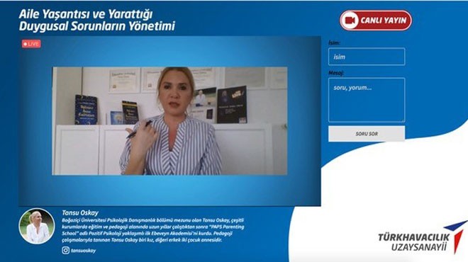 Yaklaşık 350 kişinin izlediği TUSAŞ çalışanının katılımı ile düzenlenen ilk canlı yayın oturumu Pedagog Tansu Oskay’ın katılımı ile gerçekleştirildi. Oskay, korona virüsü döneminde çocuklarla nasıl iletişim kurulması gerektiği ile ilgili önemli açıklamalarda bulundu. Oskay, çocukların bu süreci en iyi şekilde atlatmasının formülünün pozitif ebeveynlik olduğunu belirterek, izleyicilerden gelen sorular üzerine de şu tavsiyelerde bulundu: