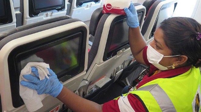 Dezenfeksiyon işlemi ile baş üstü dolapları, pencereler, koltuk başları, koltuk kenarları, mutfak ve lavabolar başta olmak üzere yolcuların ve uçuş ekibinin temas ettiği her nokta derinlemesine temizleniyor. Her uçuştan sonra battaniye ve yastık gibi tekstil ürünleri değiştirilerek yüksek sıcaklıkta yıkama işlemi uygulanıyor.