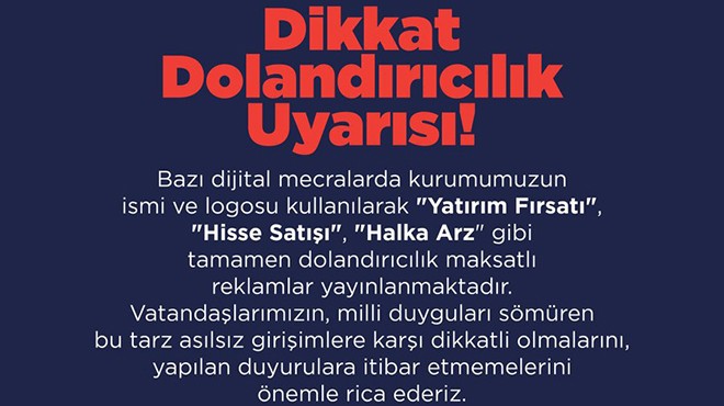 “Bazı dijital mecralarda kurumumuzun ismi ve logosu kullanılarak "Yatırım Fırsatı", "Hisse Satışı", "Halka Arz" gibi tamamen dolandırıcılık maksatlı reklamlar yayınlanmaktadır.