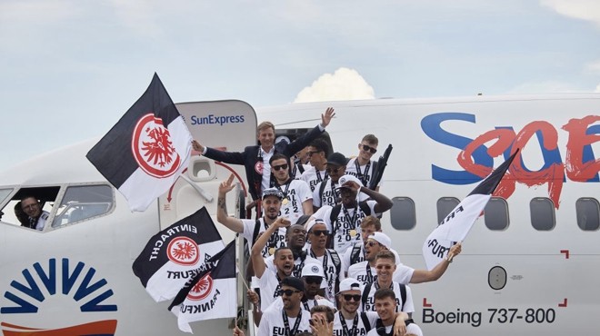 UEFA Avrupa Ligi Kupasını kazanan Eintracht Frankfurt futbol takımı, maçtan sonra özel Eintracht Frankfurt giydirmeli SunExpress uçağı ile Frankfurt'a döndü.