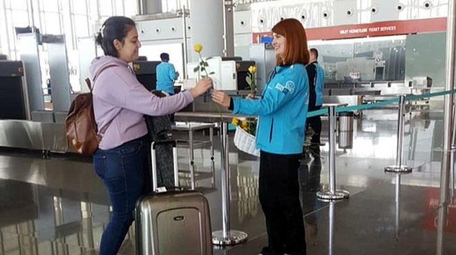Terminale giriş yapan yolcular, geçtiğimiz günlerde bir bölümü görev yapmaya başlayan “Bana Sor “ ekipleri tarafından karşılanıyor. Gençler kadın yolculara çiçek vererek Dünya Kadınlar Günü’nü kutluyor. Aynı zamanda da uçaklarının bulunduğu körüklere yönlendiriyor.
