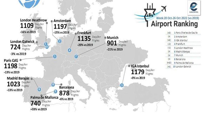 Avrupa Hava Seyrüsefer Emniyeti Teşkilatı Eurocontrol, 20-26 Ekim 2022 dönemi Kapsamlı Değerlendirme Raporu'nu yayınladı. Rapora göre, İstanbul Havalimanı günlük ortalama 1179 uçuşla Avrupa’da söz konusu haftada en yoğun 3. havalimanı oldu.