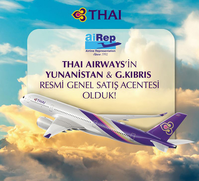 Uzun yıllardır Thai Airways International’ı Türkiye’de başarıyla temsil eden AiRep, Türkiye sözleşmesini 3 yıllığına yenilemenin yanı sıra, artık Yunanistan ve G.Kıbrıs’ta da THAI’nin resmi Genel Satış Acentesi (GSA) oldu.