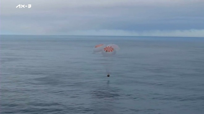 Ax-3 ekibini taşıyan SpaceX'e ait Dragon kapsülü, Florida açıklarında okyanusa indi. Kapsülün, yer ekibi tarafından gemiye alınması bekleniyor.