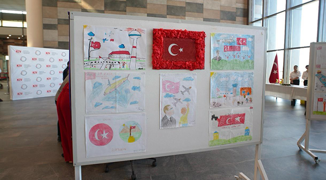 Havalimanı çalışanları, paydaşları ve ziyaretçilerinin 6-14 yaş çocuklarının; Atatürk, Türk bayrağı ve gelecek temalı resimleri, 'Cumhuriyetin Işığıyla Gökyüzüne' Sergisi kapsamında havalimanında sergilendi.