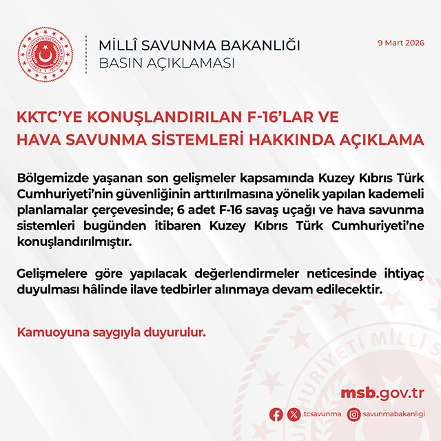 “Bölgemizde yaşanan son gelişmeler kapsamında Kuzey Kıbrıs Türk Cumhuriyeti'nin güvenliğinin arttırılmasına yönelik yapılan kademeli planlamalar çerçevesinde; 6 adet F-16 savaş uçağı ve hava savunma sistemleri bugünden itibaren Kuzey Kıbrıs Türk Cumhuriyeti'ne konuşlandırılmıştır.