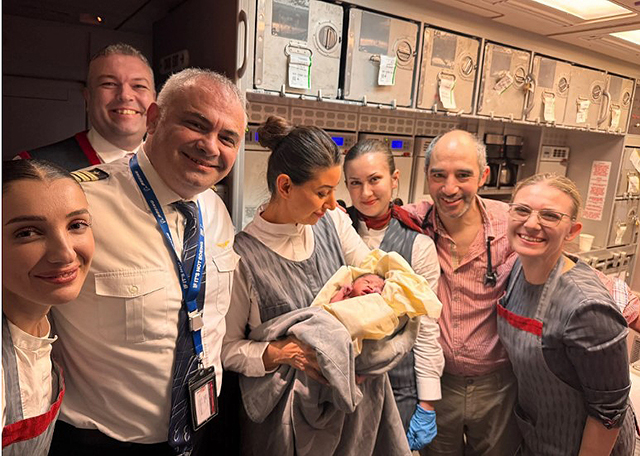 Türk Hava Yolları’nın (THY) dün İstanbul-Manila seferini yapan uçağında doğum sancıları artan Filipinli yolcu, doktor ve kabin ekibinin yardımıyla doğum yaptı. Doğum sonrası uçuş ekibi Filipinli anne ve bebekle hatıra fotoğrafı çektirdi.