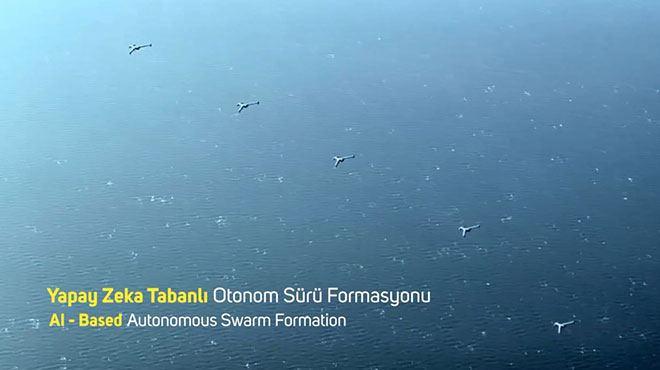 Keşan Uçuş Eğitim ve Test Merkezi’nden havalanan 5 adet K2 Kamikaze İHA, iki gündür Saros Körfezi üzerinde gerçekleştirilen çoklu testlerde “sağ kademe”, “çizgi” ve “V” dizilimli formasyon uçuşlarını gökyüzünde başarıyla icra etti. Test senaryolarında K2 platformları, yapay zekâ, sensör ve yazılımları vasıtasıyla sürüdeki hava araçlarına göre konum alarak filo içindeki yerlerini hatasız bir şekilde korudu ve görevleri başarıyla tamamladı. K2 Kamikaze İHA, “Turan” ve “duvar” formasyonu gibi farklı dizilimleri de başarıyla uygulayabiliyor.