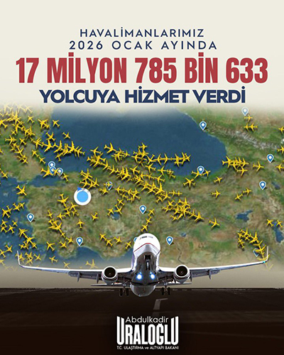 Rakamları Ulaştırma ve Altyapı Bakanı Abdulkadir Uraloğlu sosyal medya hesabından paylaştı. Bakan Uraloğlu, “Ocak ayında Türkiye genelindeki havalimanlarında, direkt transit yolcular dâhil 17,8 milyon yolcuya hizmet verdik.