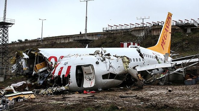 İstanbul Sabiha Gökçen Havalimanı'nda iniş yaptıktan sonra pistten çıkan uçağın enkazında Pegasus Havayolları yetkilileri incelemelerde bulundu