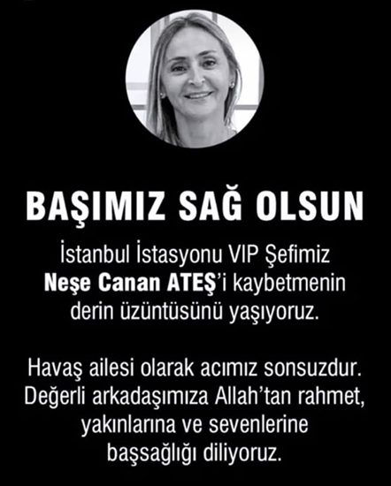 Haberair.com olarak Neşe Canan Ateş’e Allah’tan rahmet, kederli ailesi, TAV ve Havaş camiasına baş sağlığı dileriz.
